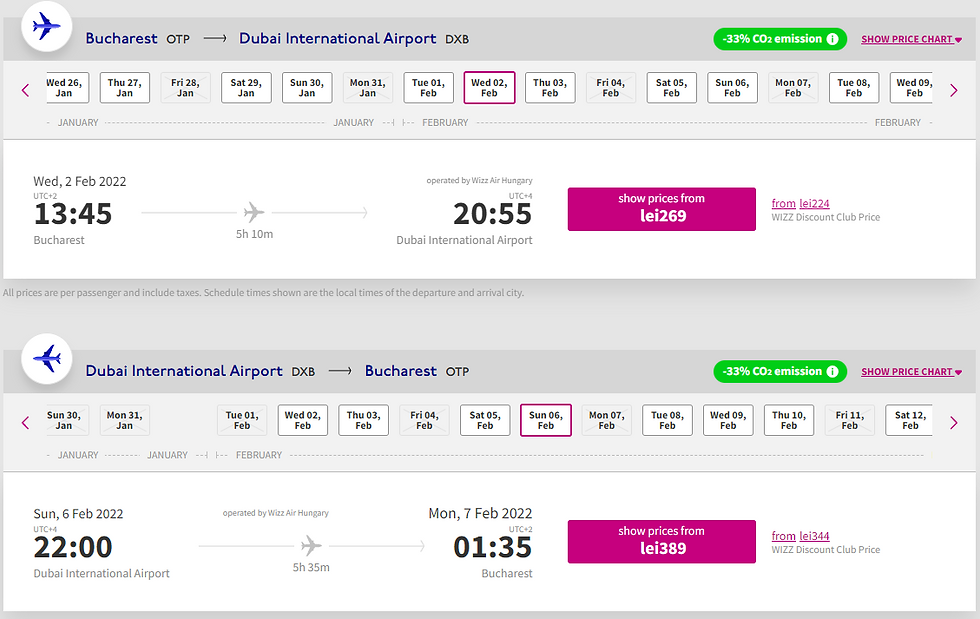 Am ales ca perioada de calatorie 2 - 6 Februarie 2022 cu plecare din Bucuresti dar preturile la biletele de avion sunt ieftine in toata luna Februarie (si sfarsitul lunii Ianuarie) cu cei de la Wizz Air. Chiar daca politica lor de retur este de toata jena, macar nu-ti pare rau de bani daca vine valul 20 de Covid, comparativ cu Fly Dubai la care ai fi platit minim 500 euro pentru acest zbor.